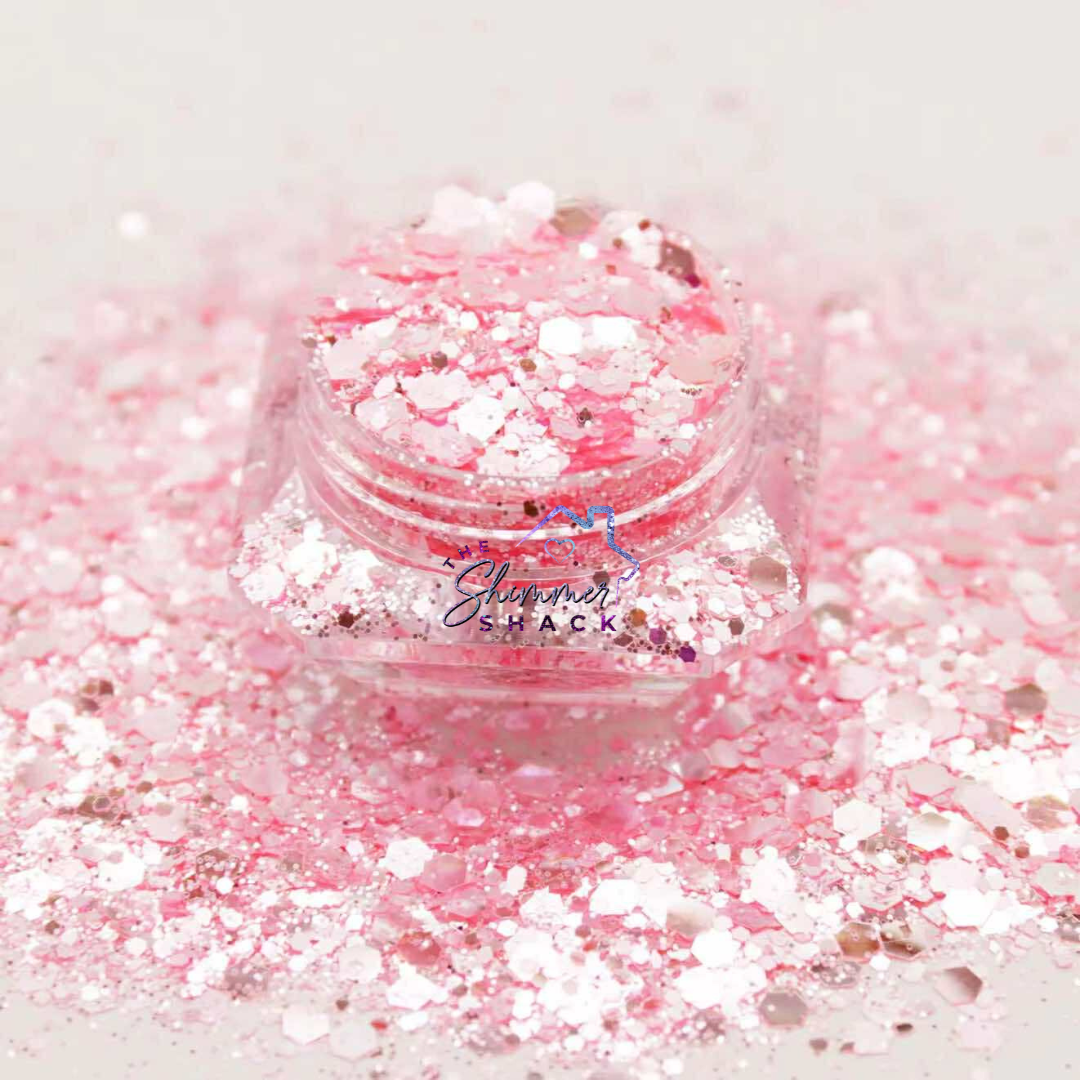 This glitter doesn’t perform she commands. A sacred blend of soft pinks, white chrome, and high-shine hexes that reflect your obsession right back at you. She’s ethereal. She’s untouchable. She’s dripping in mirrored power and made for the chosen few who don’t just craft they worship the shimmer.
