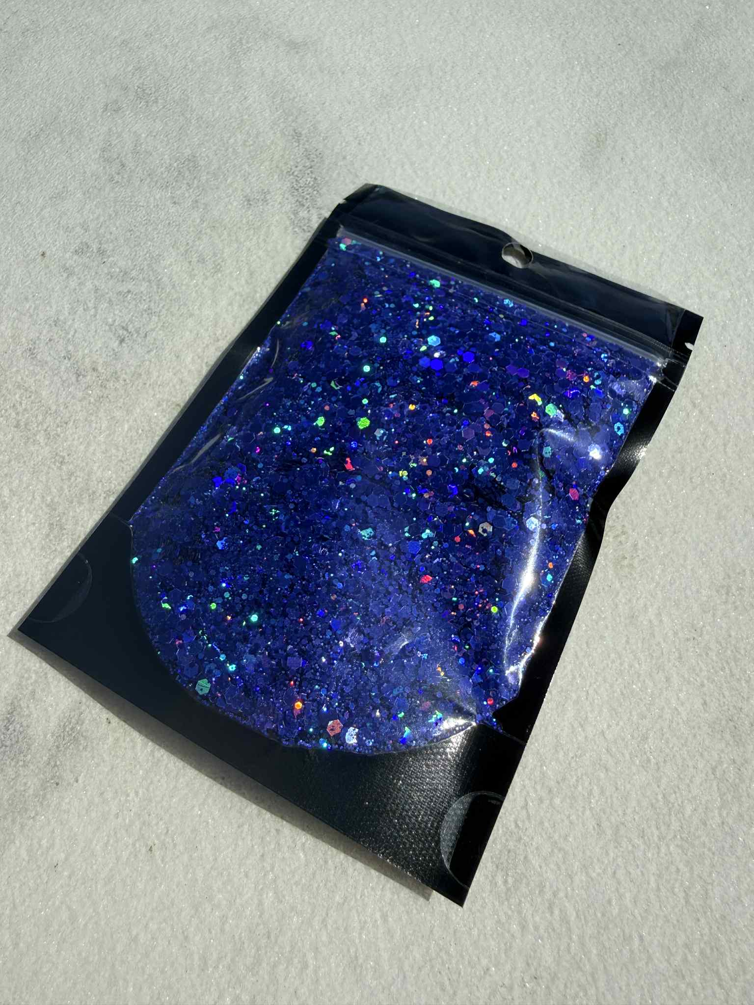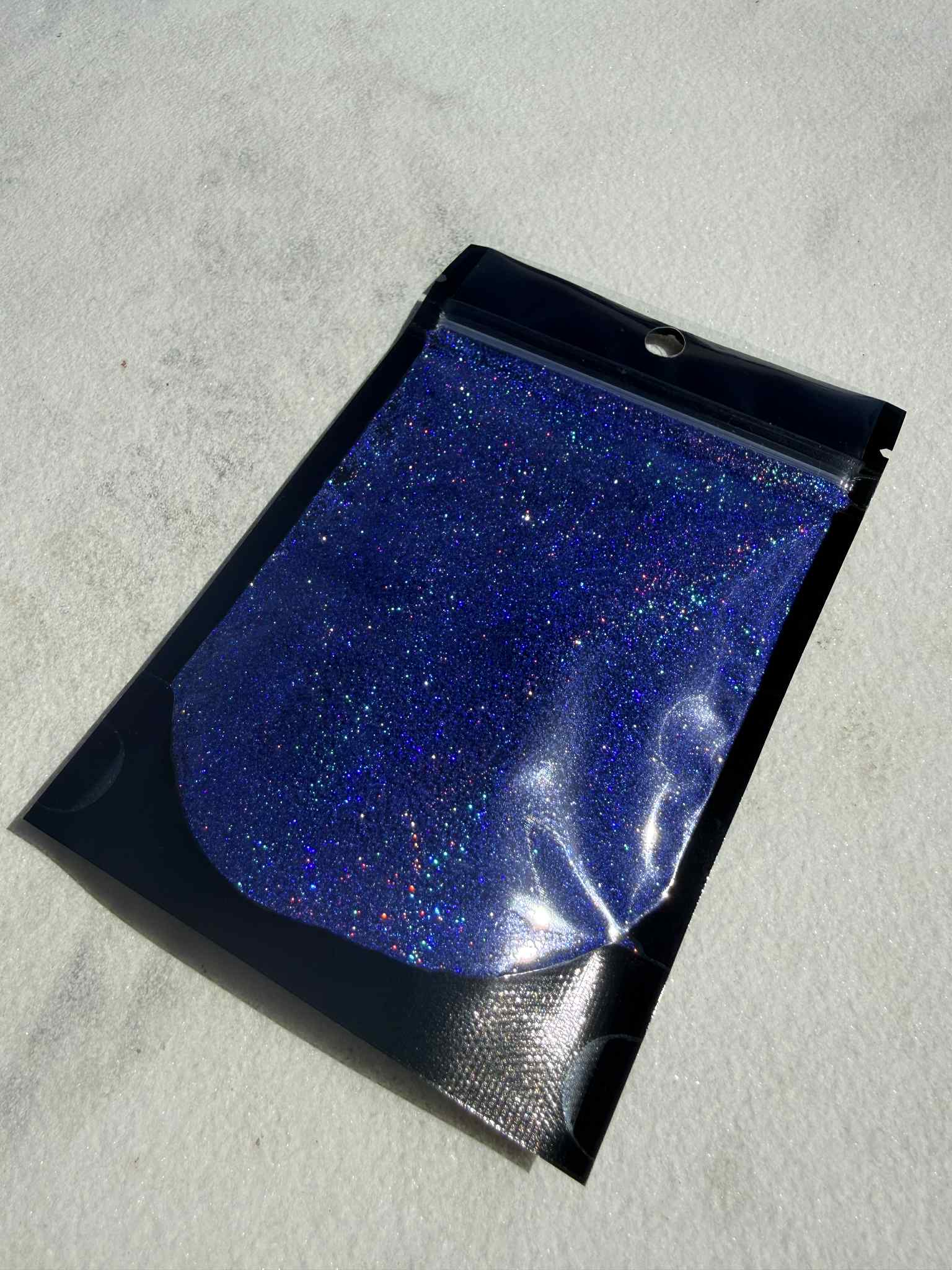 Channel the electric tension of that one unforgettable evening with our ONE NIGHT SEDUCTION GLITTER a dark blue holographic glitter that flickers with violet, teal, and silver rainbows. Available in both fine and chunky textures, in a 50 g bag. Sprinkle it over candles, resin charms, makeup looks, or sultry card decks wherever you want to summon that shimmering thrill.